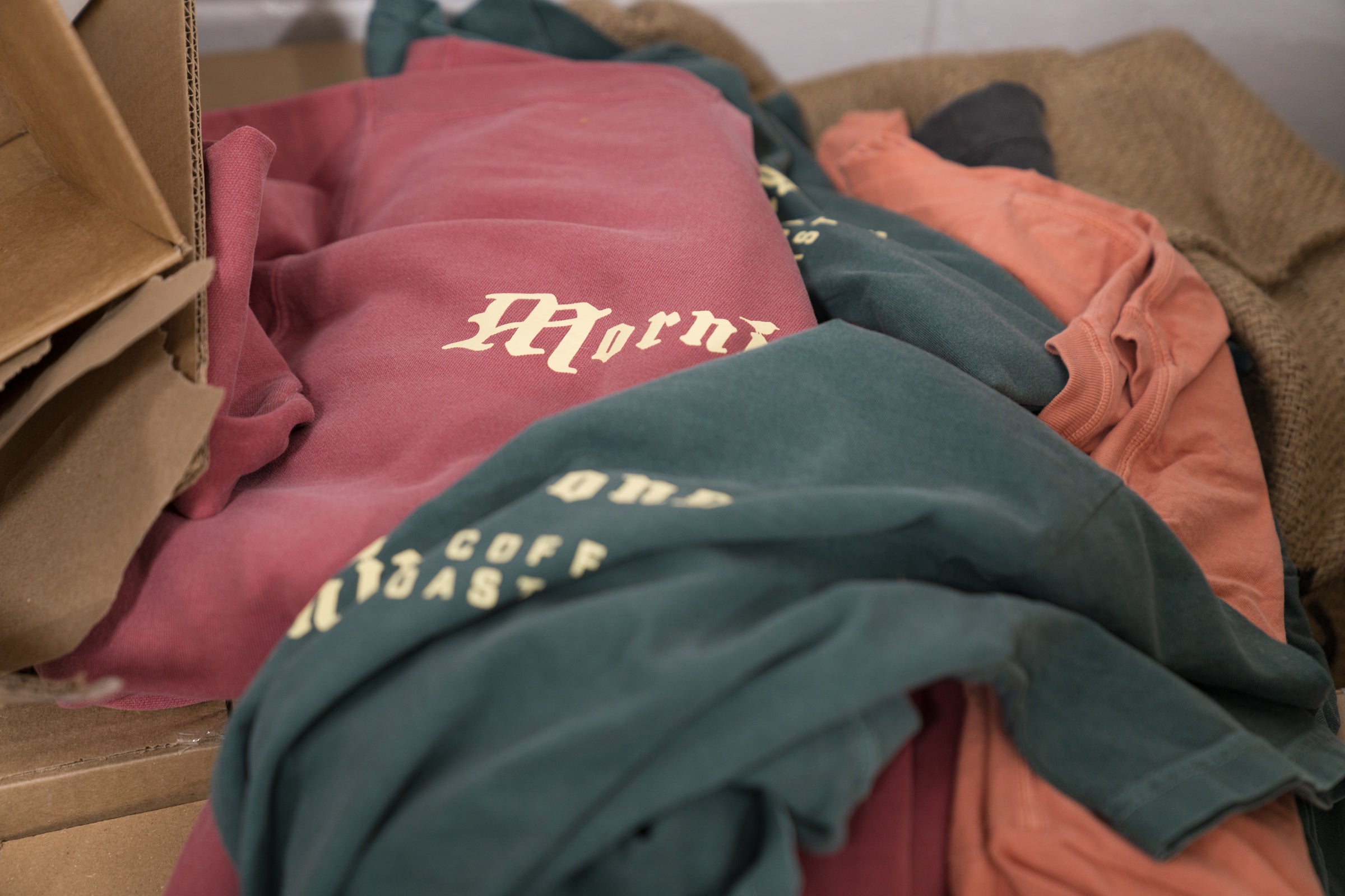 The second-best thing to drinking Morningsong Coffee is wearing it. Not like you spilled on yourself, but as in limited runs of branded apparel in a range of colors.
