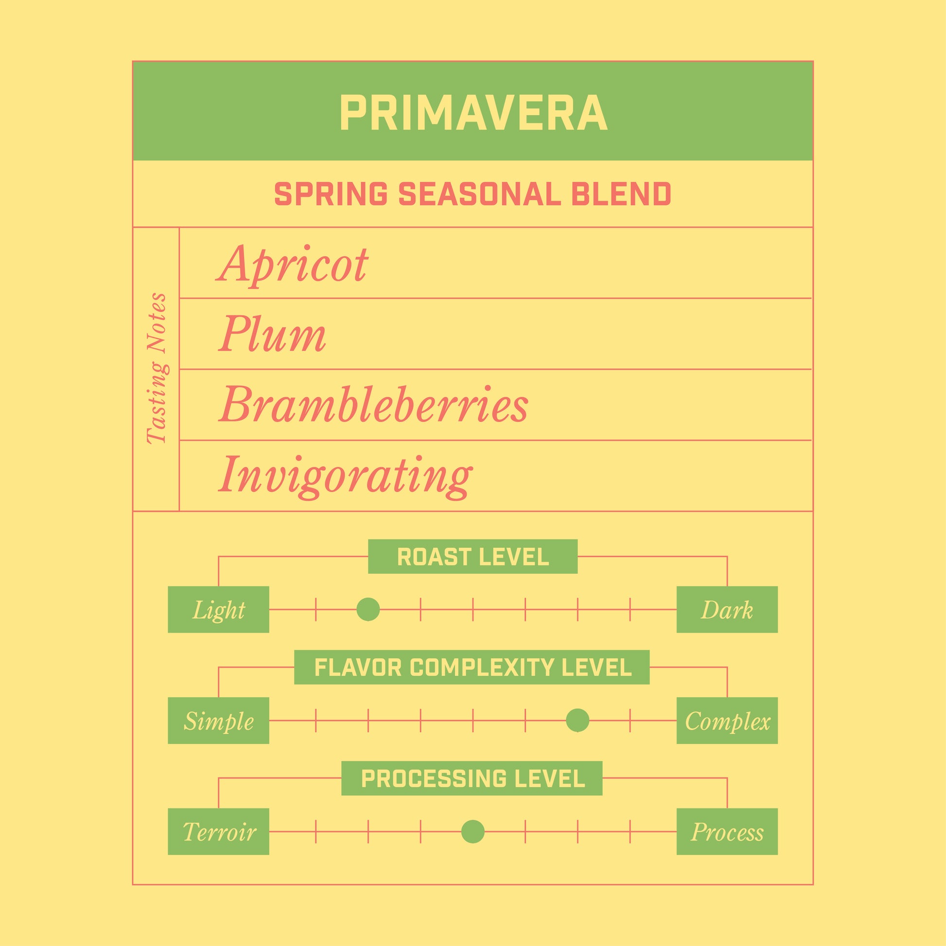 Our Primavera Spring Seasonal Blend is crafted to help you shake off your cabin fever and take your morning coffee outside for the first time in months. Bright yet balanced, this coffee is the perfect pairing for quiet mornings on the porch and working in the yard. Expect a round, sweet cup with complex berries, stone fruit, and citrus complexity.